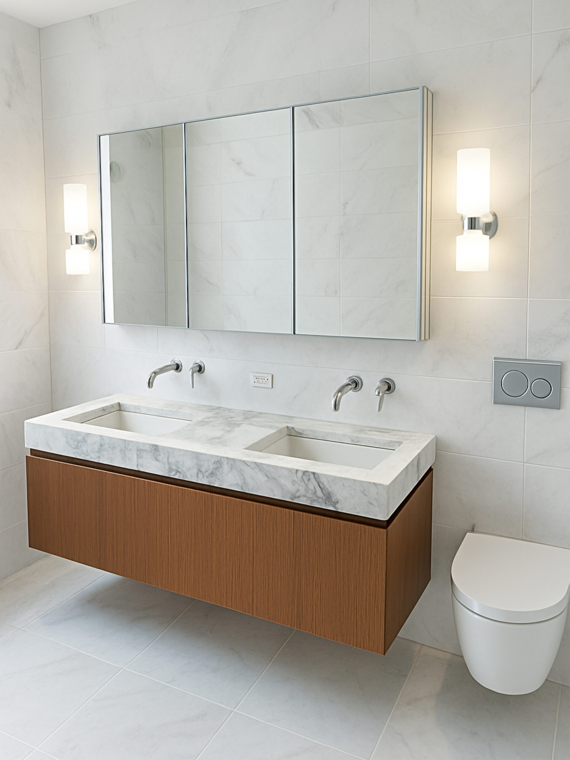 On Park Avenue, Apex transformed a bathroom within a distinguished prewar apartment—merging classic architectural character with contemporary elegance. Refined materials, balanced lighting, and timeless detailing