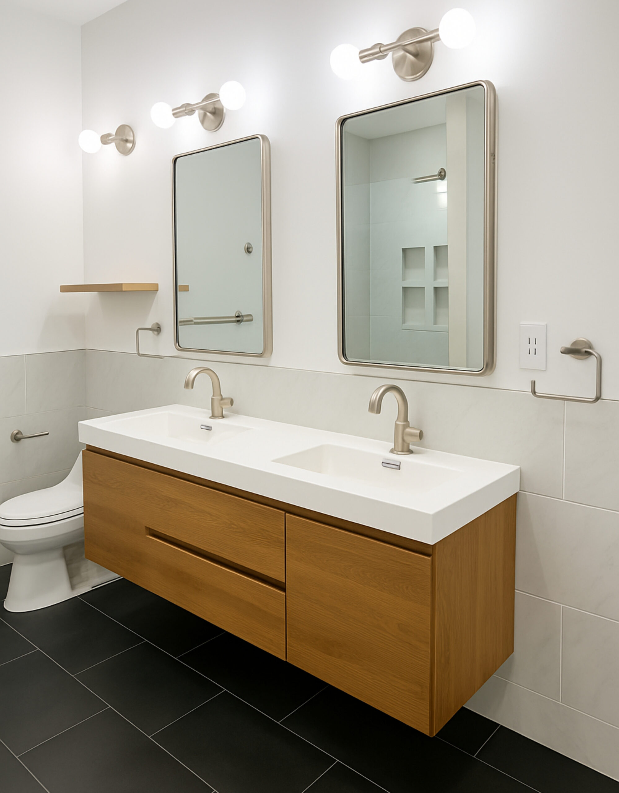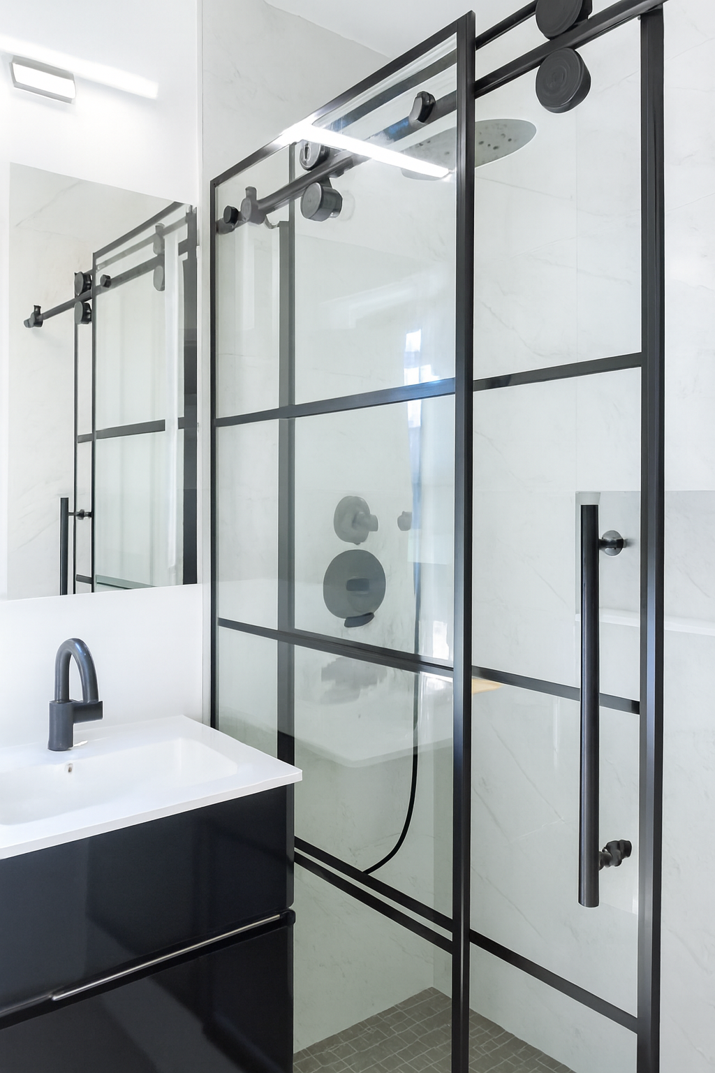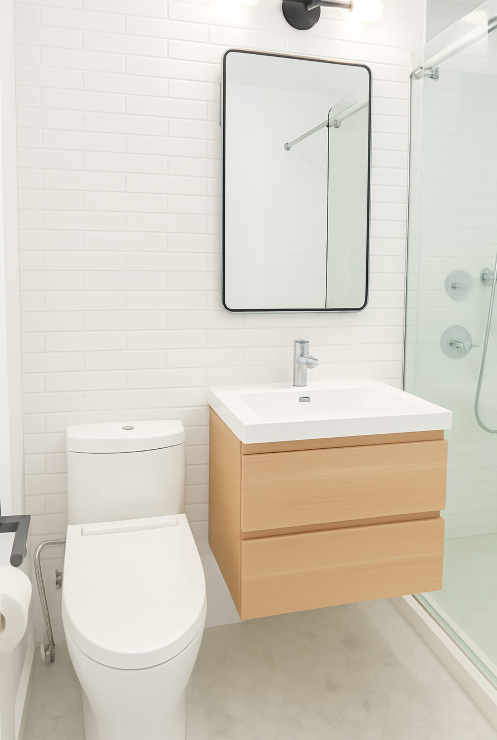 In Midtown Manhattan, Apex carried out a full gut renovation of a postwar bathroom—transforming a dated space into a modern statement of urban calm. Minimalist